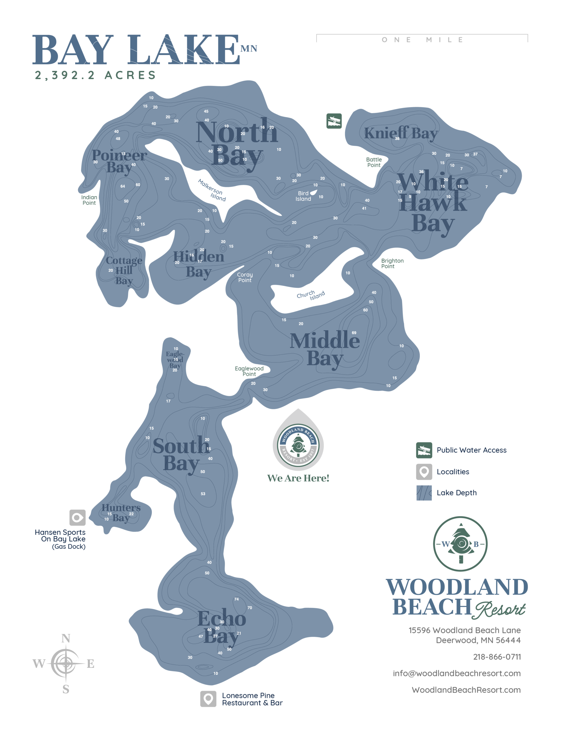 These maps are here to help you make the most of your stay at Woodland Beach Resort. The resort map highlights the location of your “Up North” cabin and shows the many amenities and features across the property. The Bay Lake map showcases why this lake is considered one of the premier destinations in the Brainerd Lakes area. With its scenic bays, islands, and recreational opportunities, Bay Lake is perfect for family fun and lakeside adventure.